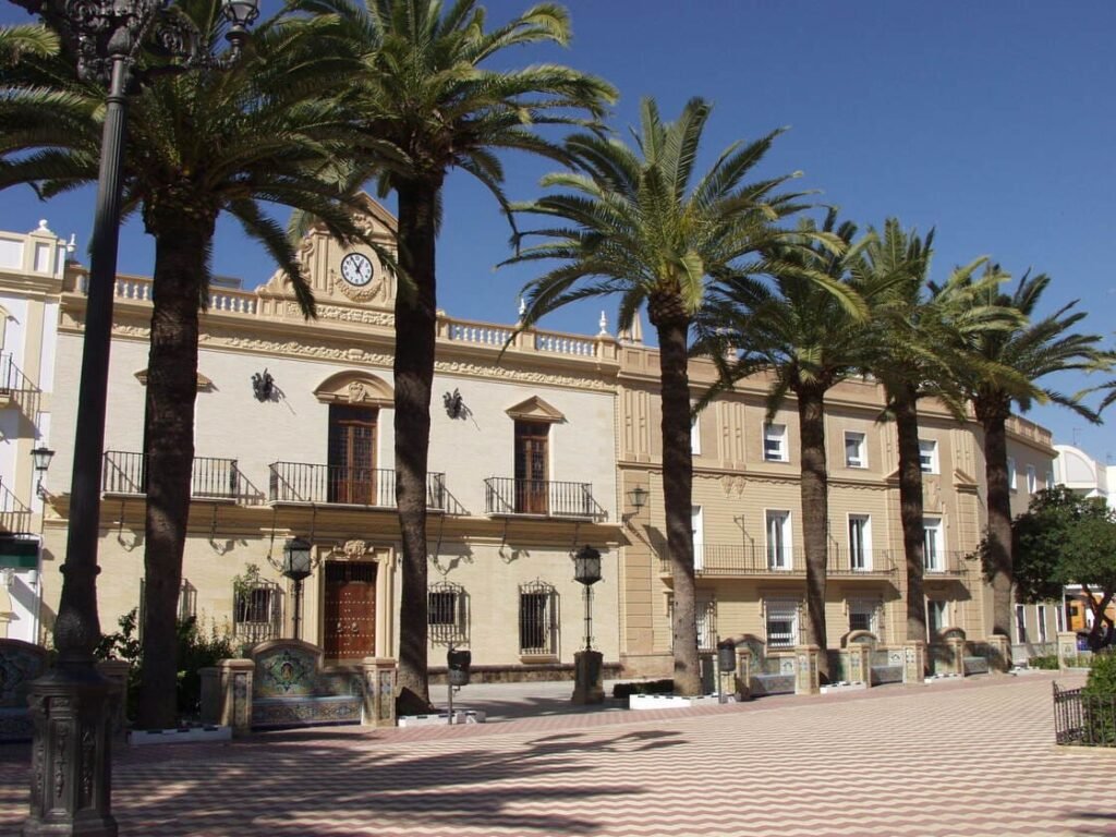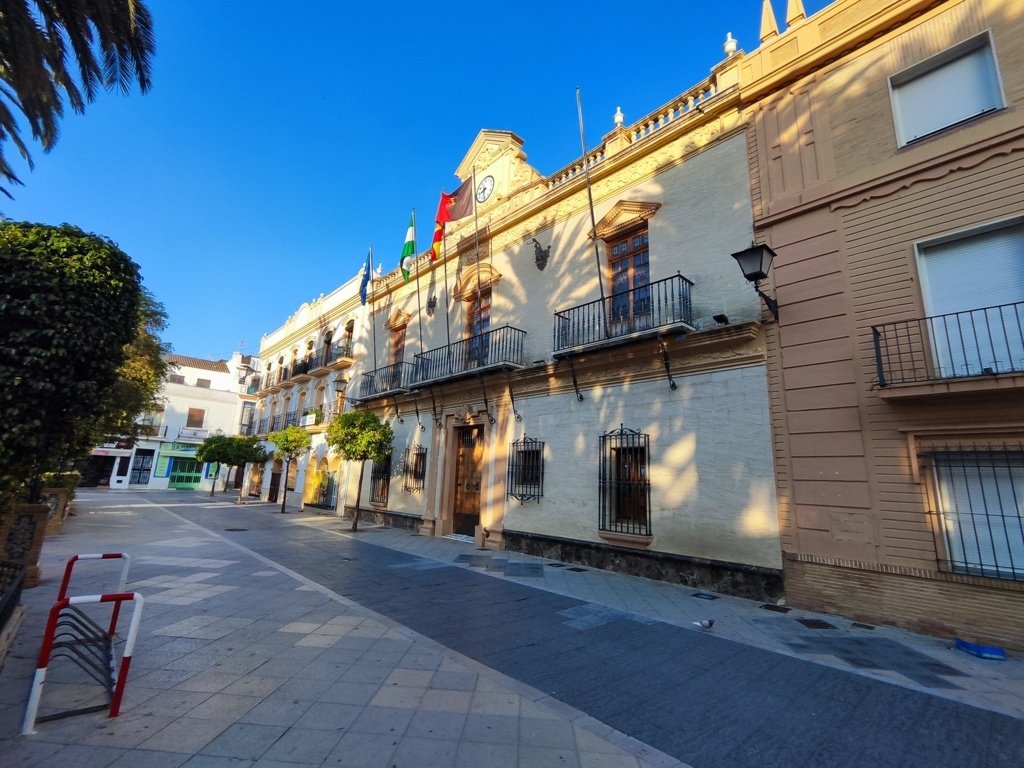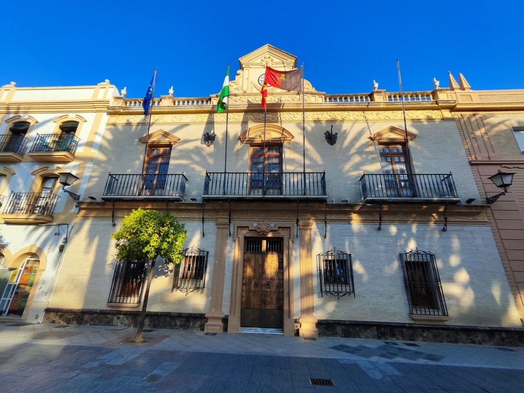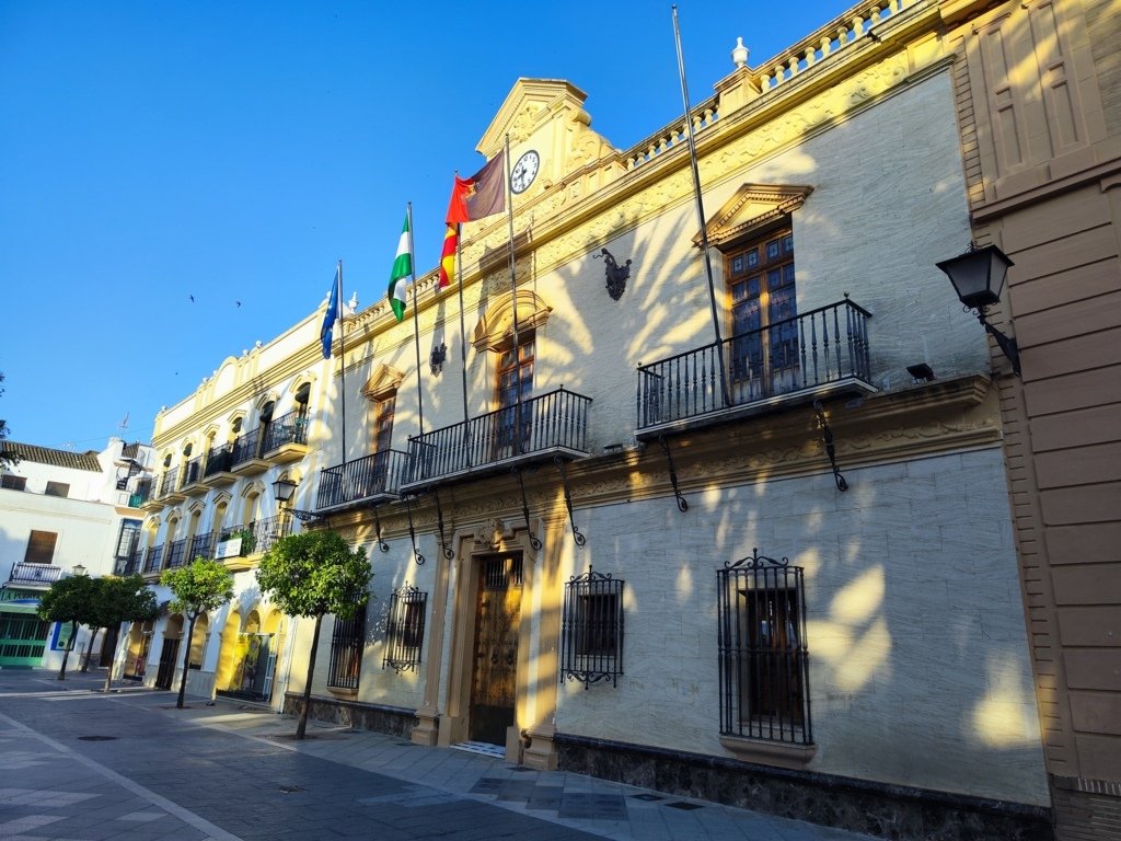 Ocupa gran parte de un lateral de la plaza de la Laguna, espacio público principal de la zona baja del casco antiguo, de diseño regionalista y gran valor ambiental. El edificio, entre medianeras, configura un extenso conjunto que se prolonga en esquina hasta la calle Bailén. Su origen se remite a la Casa Marchena, o de la Laguna, edificada en 1740-1742 por el mercader de Indias Manuel Rivero, el Pintado, adquirida por el Ayuntamiento y adaptada en 1928 para sede municipal junto con un inmueble nuevo colindante por el arquitecto Jorge Gallego; en 2002 se concluyó la ampliación y rehabilitación de las edificaciones con proyecto de Andrés Bruno Romero Mantero y Gonzalo Delgado Vizcaíno. Delimita una planta trapezoidal, con dos alturas en la casa primitiva y tres en el resto, con azoteas y tres patios. La fachada de la antigua casa es de orden clásico remodelada en estilo regionalista neobarroco, con entrada adintelada entre pilastras bajo balcón y frontón con un reloj que sobresale en la balaustrada; los alzados de los cuerpos adyacentes evocan una composición de líneas acordes. El interior de la casa se ordena en torno a un patio con galerías de arcos sobre columnas y zócalos de azulejos en planta baja y balcones en la alta, cerrado por una montera.