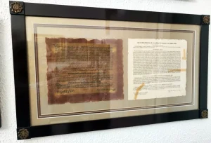 Este documento excepcional, es una bula papal de indulgencias del año 1455 impresa por Gutenberg en su primera prensa. A la izquierda está la bula papal y a su derecha su traducción al español.