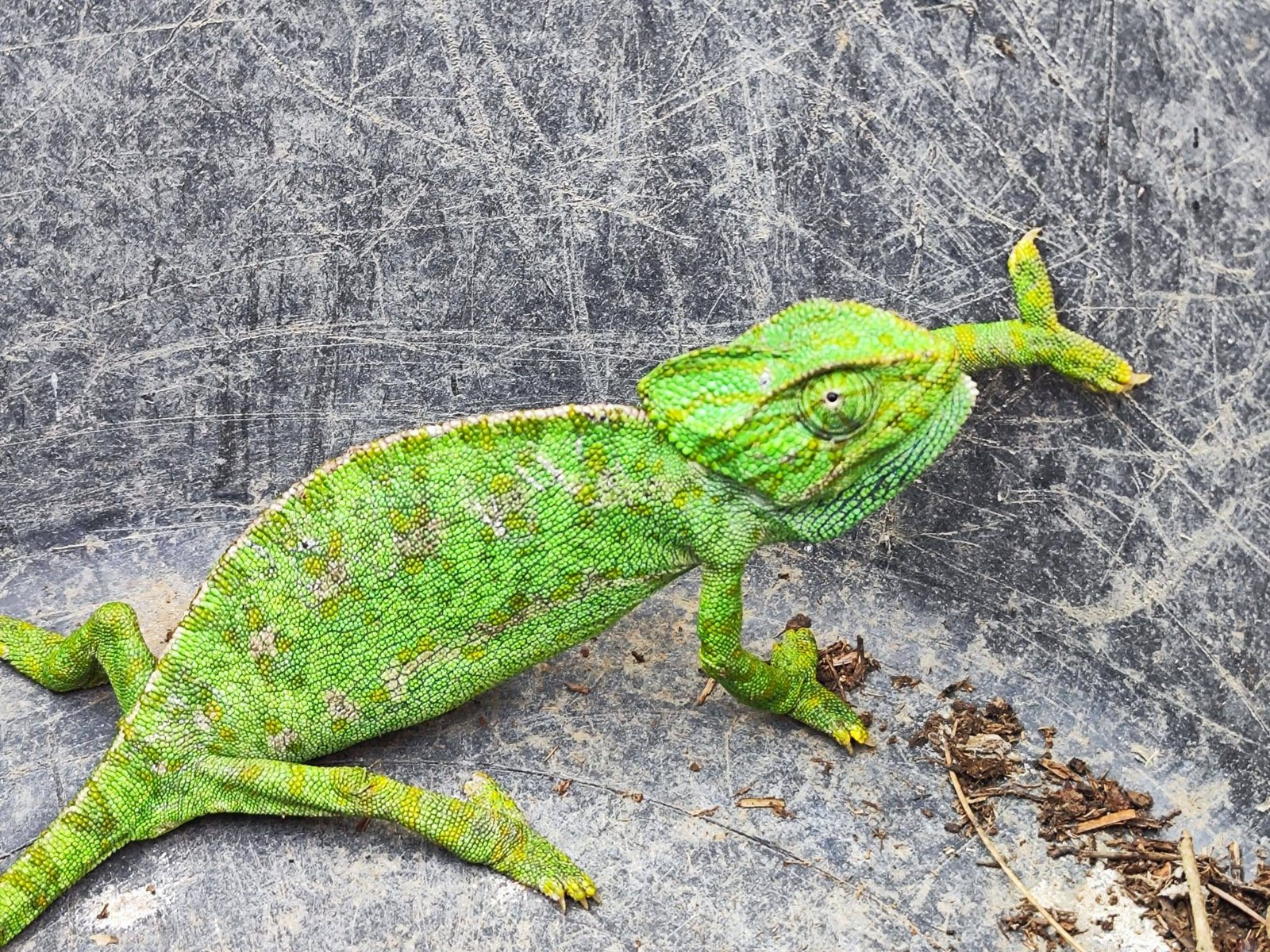 Especie de aspecto inconfundible: cuerpo aplanado lateralmente, ojos prominentes, cabeza con casco llamativo, cola prensil, escamas granulares y dedos distribuidos en disposición 3+2. Se registra dicromatismo sexual con un patrón de coloración corporal (o librea) muy complejo y relacionado con el sexo, estado reproductor y las necesidades de termorregulación.