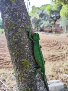 Activa todo el año generalmente, excepto enero y febrero. Especie diurna, solitaria y fuertemente territorial (sólo los machos) durante el ciclo reproductor. Ocasionalmente, sobre todo en invierno, varios animales pueden compartir un mismo árbol.