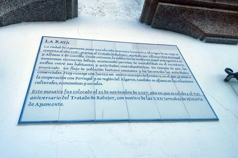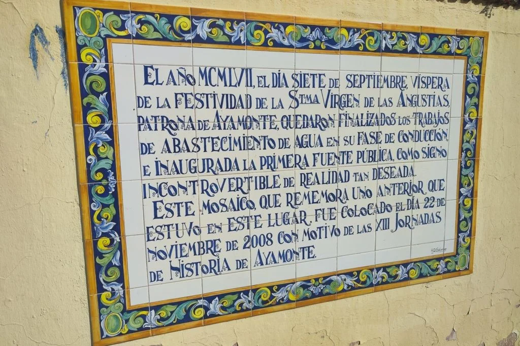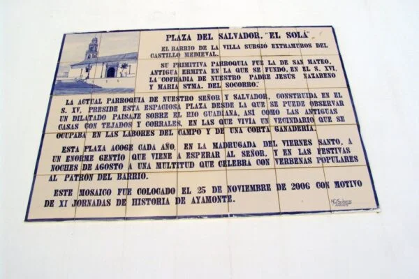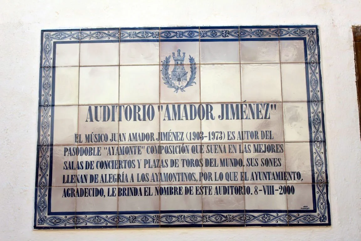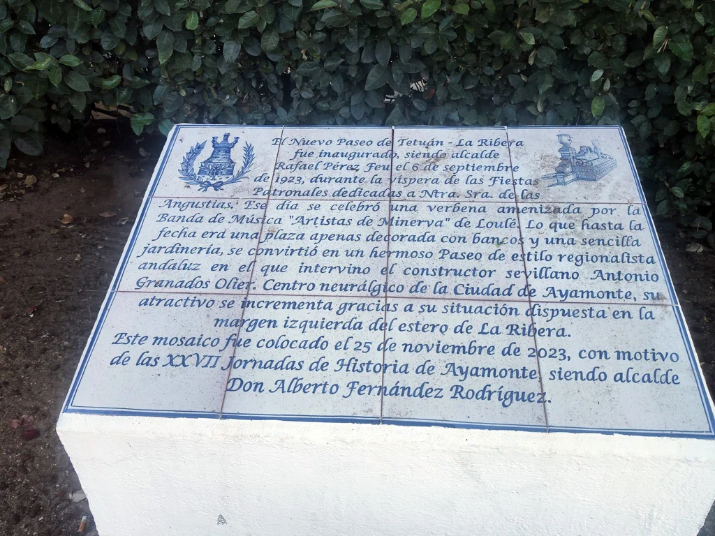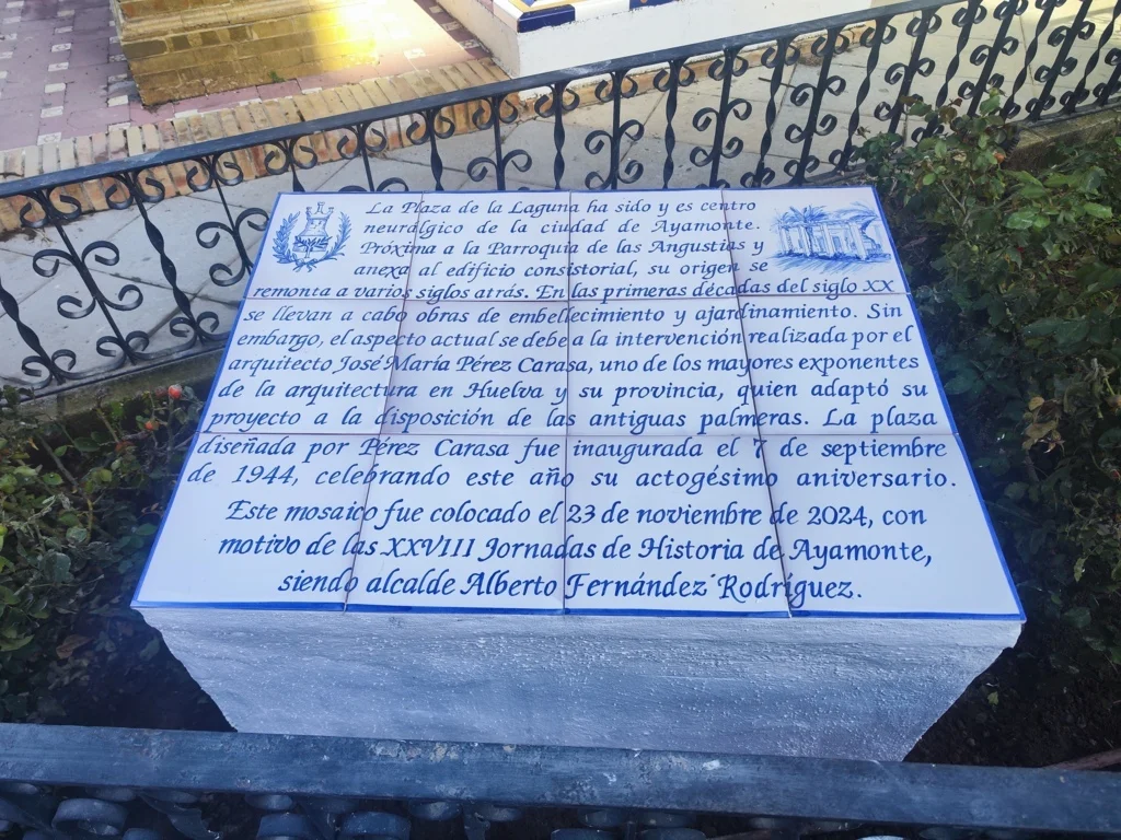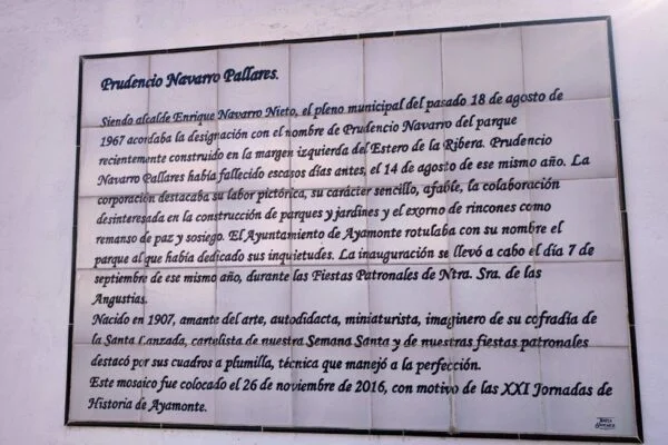 AZULEJOS CONMEMORATIVOS, JORNADAS DE HISTORIA… PANEL CONMEMORATIVO Y DECORACIÓN AL MONUMENTO DE LA INMACULADA CONCEPCIÓN EN LA PLAZA DE LA LAGUNA 1954 AZULEJO CONMEMORATIVO PASEO DE LA RIBERA 2023 AZULEJO CONMEMORATIVO PLAZA DE LA LAGUNA 2024 PANEL DE AZULEJOS ARCO DEL TORIL. FACHADA DEL AYUNTAMIENTO 2002 PANEL DE AZULEJOS JOSÉ PÉREZ BARROSO. CALLE JOSÉ PÉREZ BARROSO 2015 PANEL DE AZULEJOS SAN DIEGO DE ALCALÁ PATRÓN DE AYAMONTE. ENTRADA TEMPLO SAN FRANCISCO PANEL DE AZULEJOS JUAN DE ZAMORA. CALLE JUAN DE ZAMORA 2004 PANEL DE AZULEJOS SOBRE LOS ORÍGENES PUNTA DEL MORAL PANEL DE AZULEJOS SOBRE LA GUERRA DE LA INDEPENDENCIA EN CANELA. ENTRADA BARRIADA CANELA PANEL DE AZULEJOS SOBRE EL CASTILLO DE AYAMONTE. EN LOS JARDINES DEL PARADOR NACIONAL DE TURISMO 2001 PANEL DE AZULEJOS SOBRE EL HOSPITAL DE LA PIEDAD. CALLE LUSITANIA 2009 PANEL DE AZULEJOS SOBRE RODRIGO DE XEREZ. CALLE RODRIGO DE XEREZ 2007 PANEL DE AZULEJOS SOBRE MANUEL GONZÁLEZ DE AGUILAR. CALLE GONZÁLEZ DE AGUILAR 2005 PANEL DE AZULEJOS SOBRE LA RAYA (FRONTERA ESPAÑA-PORTUGAL). EDIFICIO ANTIGUA ADUANA 2017 PANEL DE AZULEJOS SOBRE LOS ORÍGENES DE LA BARRIADA FEDERICO MAYO 2022 PANEL DE AZULEJOS CONMEMORATIVO DE LA PRIMERA FUENTE PÚBLICA EN AYAMONTE. JUNTO A LA PLAZA JIMÉNEZ BARBERI 2008 PANEL DE AZULEJOS SOBRE LA PLAZA DEL SALVADOR 2006 AZULEJO POZO NUEVO DE LA VILLA PANEL DE AZULEJOS SOBRE EL TÚNEL DEL BOQUERÓN. JUNTO AL POZO NUEVO DE LA VILLA 2011 PANEL DE AZULEJOS SOBRE EL HOSPITAL DE NIÑOS EXPÓSITOS. FACHADA ANTIGUA CASA CUNA EN LA VILLA 2013 PANEL DE AZULEJOS SOBRE EL PILAR DE LA VILLA 1998 PANEL DE AZULEJOS SOBRE EL CONVENTO DE LAS HERMANAS DE LA CRUZ 2003 PANEL DE AZULEJOS SOBRE EL PASEO DE LA RIBERA EN EL SIGLO XIX. CALLE DOMINGO RAMÍREZ «DE LOS CABALLITOS» 2012 PANEL DE AZULEJOS SOBRE EL PARQUE PRUDENCIO NAVARRO 2016 PANEL DE AZULEJOS POZO DE LOS ALMENDROS. CALLE SANTA CLARA 1998 PANEL DE AZULEJOS AUDITORIO AMADOR JIMÉNEZ 2000 PANEL CONMEMORATIVO DE INAUGURACIÓN DEL TENDIDO ELÉCTRICO EN HUERTA BORREGURO 1970 PANEL CONMEMORATIVO DE LA INAUGURACIÓN DE LA INSTALACIÓN DE AGUA EN LA HUERTA BORREGUERO 1969