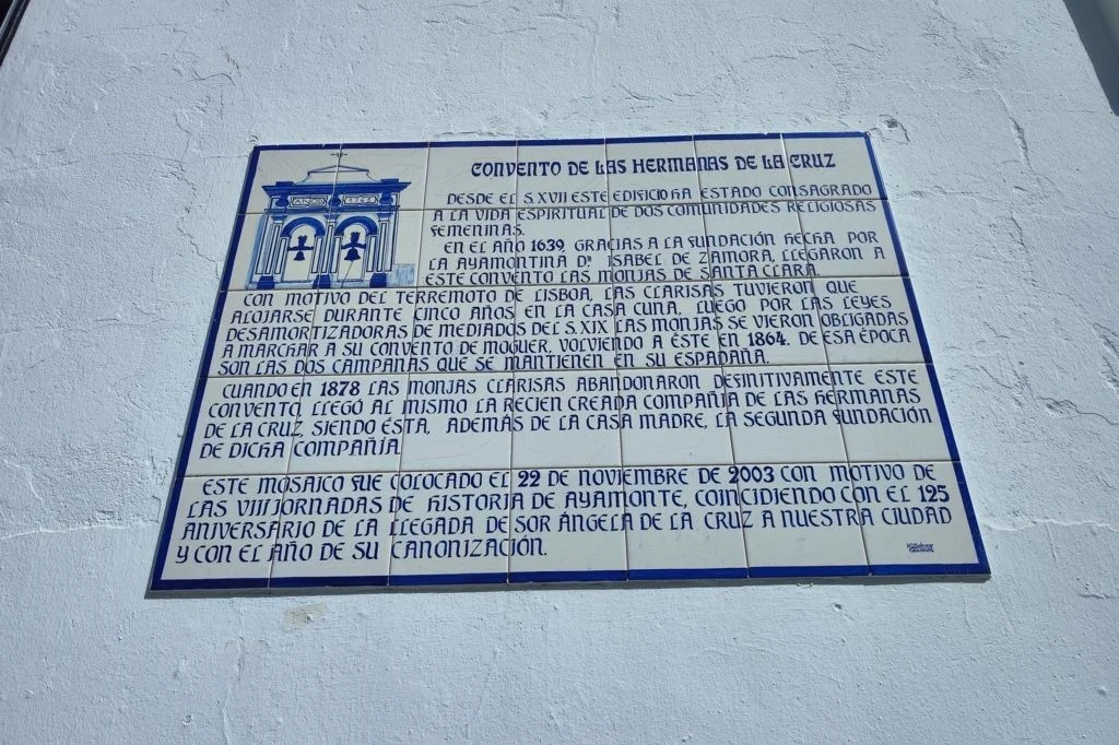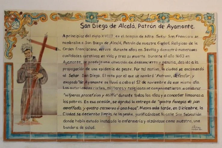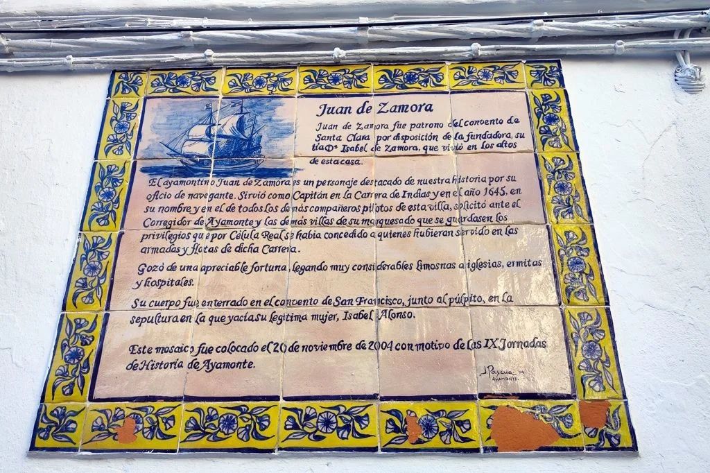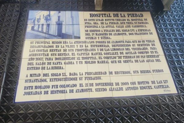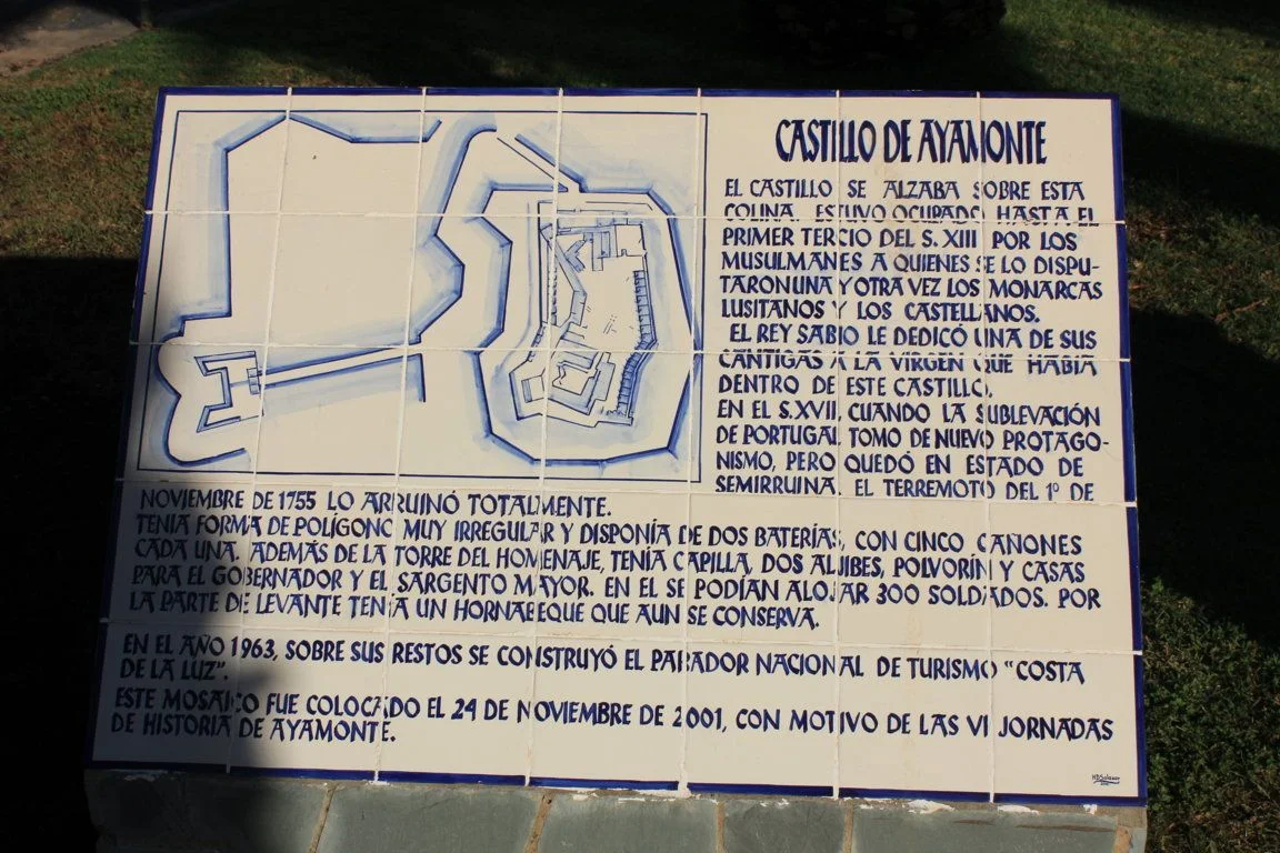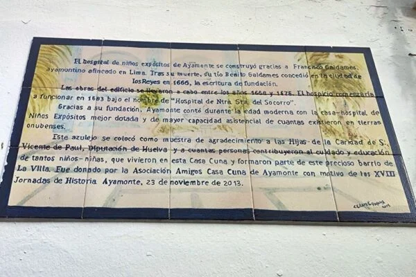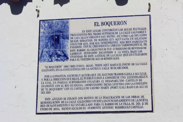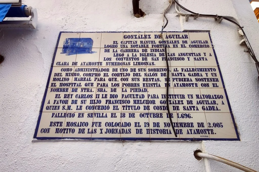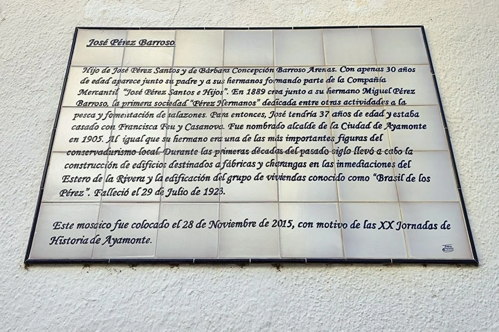 AZULEJOS CONMEMORATIVOS, JORNADAS DE HISTORIA… PANEL CONMEMORATIVO Y DECORACIÓN AL MONUMENTO DE LA INMACULADA CONCEPCIÓN EN LA PLAZA DE LA LAGUNA 1954 AZULEJO CONMEMORATIVO PASEO DE LA RIBERA 2023 AZULEJO CONMEMORATIVO PLAZA DE LA LAGUNA 2024 PANEL DE AZULEJOS ARCO DEL TORIL. FACHADA DEL AYUNTAMIENTO 2002 PANEL DE AZULEJOS JOSÉ PÉREZ BARROSO. CALLE JOSÉ PÉREZ BARROSO 2015 PANEL DE AZULEJOS SAN DIEGO DE ALCALÁ PATRÓN DE AYAMONTE. ENTRADA TEMPLO SAN FRANCISCO PANEL DE AZULEJOS JUAN DE ZAMORA. CALLE JUAN DE ZAMORA 2004 PANEL DE AZULEJOS SOBRE LOS ORÍGENES PUNTA DEL MORAL PANEL DE AZULEJOS SOBRE LA GUERRA DE LA INDEPENDENCIA EN CANELA. ENTRADA BARRIADA CANELA PANEL DE AZULEJOS SOBRE EL CASTILLO DE AYAMONTE. EN LOS JARDINES DEL PARADOR NACIONAL DE TURISMO 2001 PANEL DE AZULEJOS SOBRE EL HOSPITAL DE LA PIEDAD. CALLE LUSITANIA 2009 PANEL DE AZULEJOS SOBRE RODRIGO DE XEREZ. CALLE RODRIGO DE XEREZ 2007 PANEL DE AZULEJOS SOBRE MANUEL GONZÁLEZ DE AGUILAR. CALLE GONZÁLEZ DE AGUILAR 2005 PANEL DE AZULEJOS SOBRE LA RAYA (FRONTERA ESPAÑA-PORTUGAL). EDIFICIO ANTIGUA ADUANA 2017 PANEL DE AZULEJOS SOBRE LOS ORÍGENES DE LA BARRIADA FEDERICO MAYO 2022 PANEL DE AZULEJOS CONMEMORATIVO DE LA PRIMERA FUENTE PÚBLICA EN AYAMONTE. JUNTO A LA PLAZA JIMÉNEZ BARBERI 2008 PANEL DE AZULEJOS SOBRE LA PLAZA DEL SALVADOR 2006 AZULEJO POZO NUEVO DE LA VILLA PANEL DE AZULEJOS SOBRE EL TÚNEL DEL BOQUERÓN. JUNTO AL POZO NUEVO DE LA VILLA 2011 PANEL DE AZULEJOS SOBRE EL HOSPITAL DE NIÑOS EXPÓSITOS. FACHADA ANTIGUA CASA CUNA EN LA VILLA 2013 PANEL DE AZULEJOS SOBRE EL PILAR DE LA VILLA 1998 PANEL DE AZULEJOS SOBRE EL CONVENTO DE LAS HERMANAS DE LA CRUZ 2003 PANEL DE AZULEJOS SOBRE EL PASEO DE LA RIBERA EN EL SIGLO XIX. CALLE DOMINGO RAMÍREZ «DE LOS CABALLITOS» 2012 PANEL DE AZULEJOS SOBRE EL PARQUE PRUDENCIO NAVARRO 2016 PANEL DE AZULEJOS POZO DE LOS ALMENDROS. CALLE SANTA CLARA 1998 PANEL DE AZULEJOS AUDITORIO AMADOR JIMÉNEZ 2000 PANEL CONMEMORATIVO DE INAUGURACIÓN DEL TENDIDO ELÉCTRICO EN HUERTA BORREGURO 1970 PANEL CONMEMORATIVO DE LA INAUGURACIÓN DE LA INSTALACIÓN DE AGUA EN LA HUERTA BORREGUERO 1969