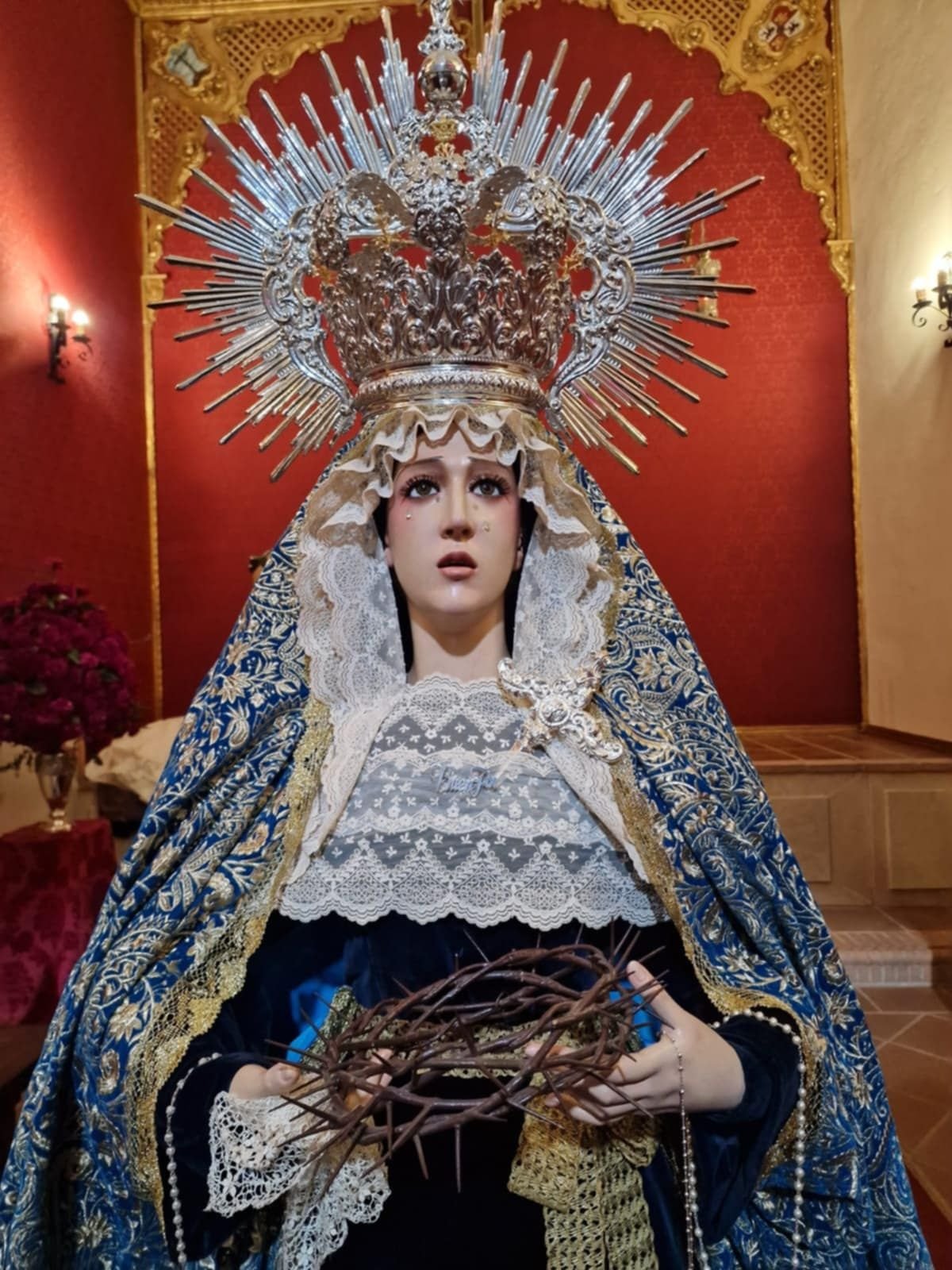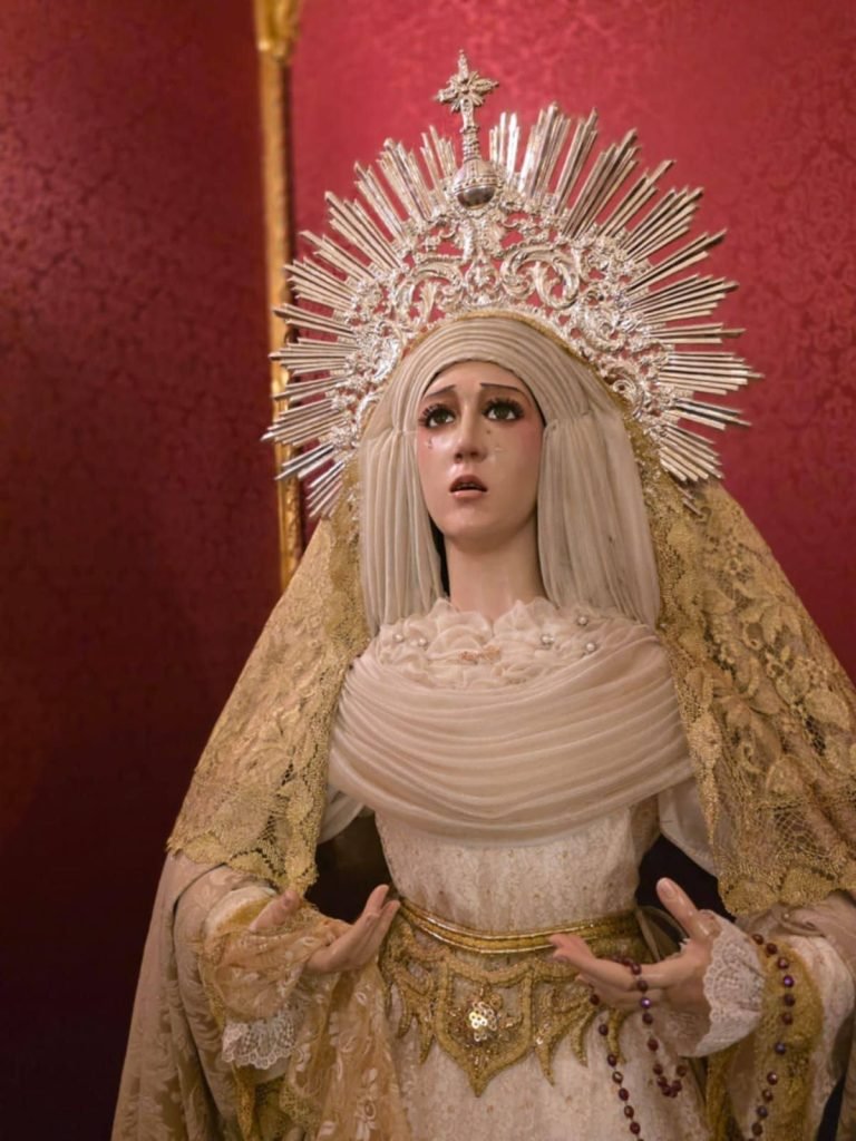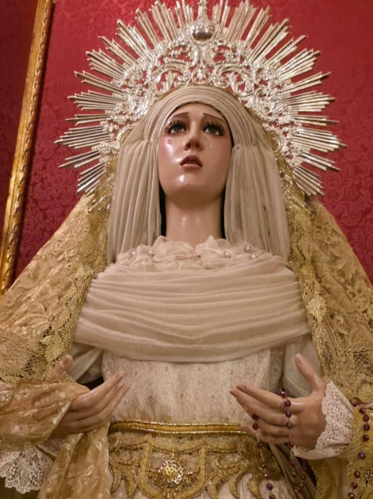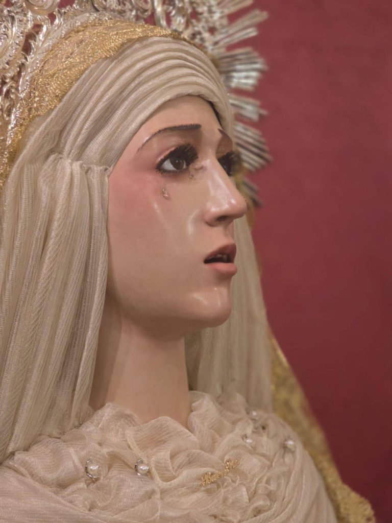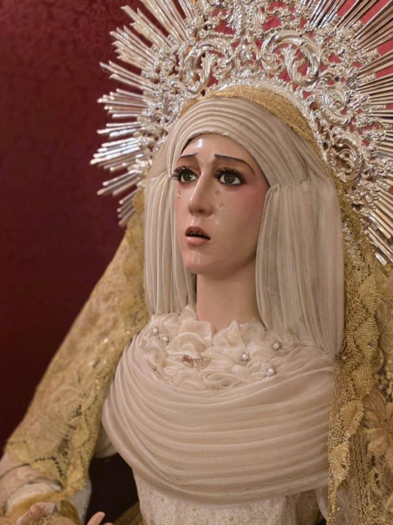 La imagen de candelero para vestir, la cabeza está inclinada a la izquierda con la mirada elevada hacia ese lado, pestañas postizas, con dos lágrimas de cristal, una en cada mejilla, boca abierta con la lengua y dientes superiores tallados, cabellera tallada recogida en un moño, manos extendidas con los dedos ligeramente flexionados. Candelero conformado por ocho listones de madera.