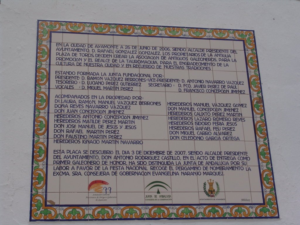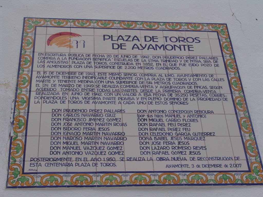 En 1895 la publicación “La Tauromaquia” de Madrid se afirma que la plaza de toros de Ayamonte es propiedad de Trinidad Luis Martínez del Molino. En 1942 Prudencio Pérez Pallarés la compra a la fundación benéfica “Escuelas de la Santísima Trinidad y de las Angustias” y al año siguiente le añade unos terrenos colindantes propiedad del Ayuntamiento. Actualmente y desde 1949 pertenece a una veintena de familias de Ayamonte.