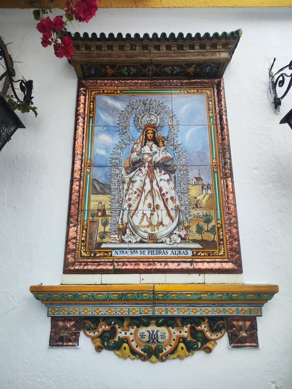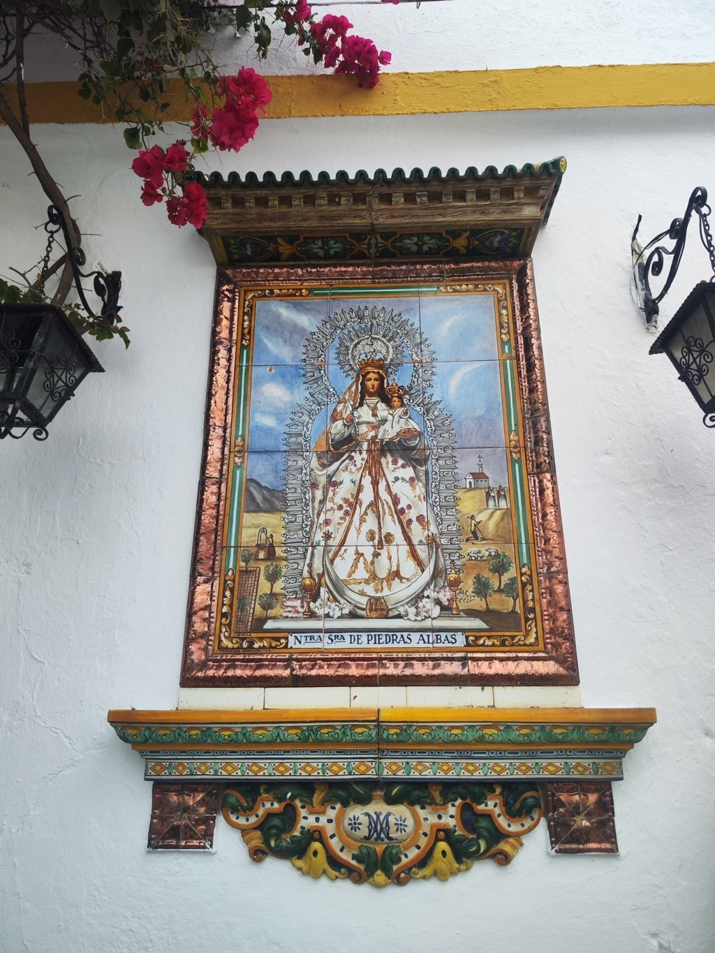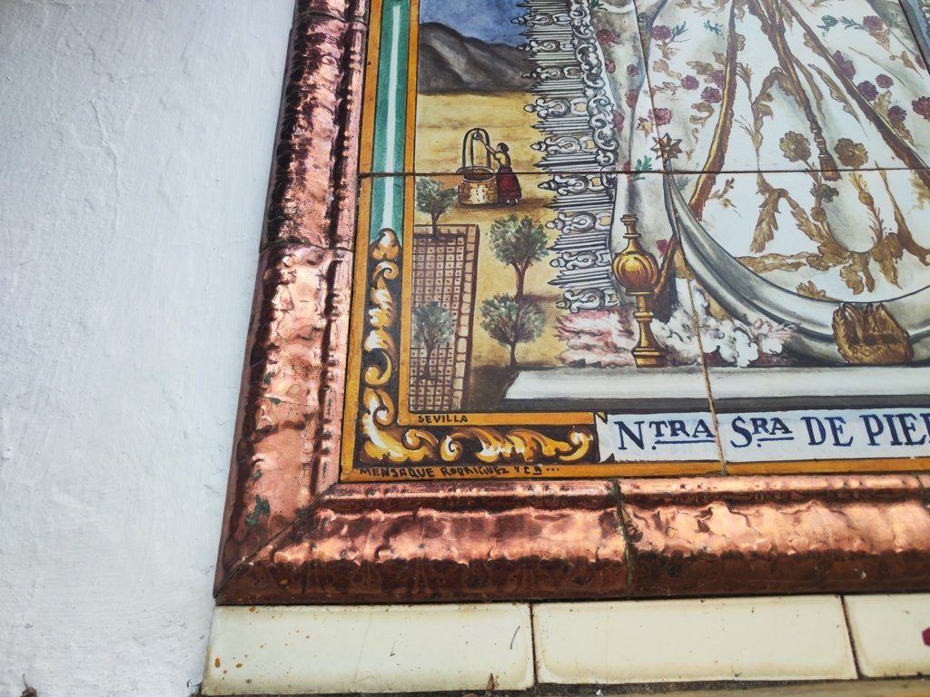 Compartimos este precioso retablo cerámico de Nuestra Señora de Piedras Albas, de la Fábrica Mensaque Rodríguez de Sevilla, de principios de la década de los 60, gracias a la generosidad de Rocío Concepción Rodríguez y Alberto Vázquez Fournier que me han permitido entrar en su casa para fotografiar este precioso retablo y otros elementos patrimoniales.