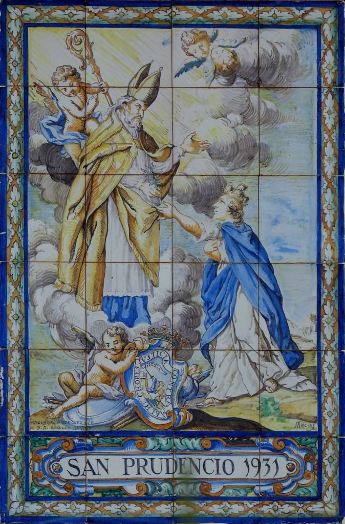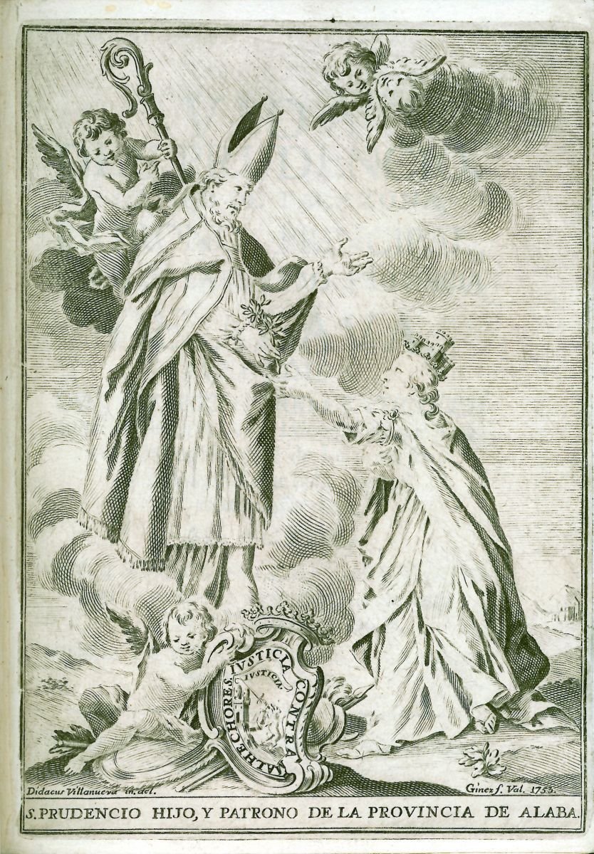 San Prudencio, patrón de Álava, aparece frente a una alegoría de la propia provincia. El retablo copia un grabado fechado en 1753.